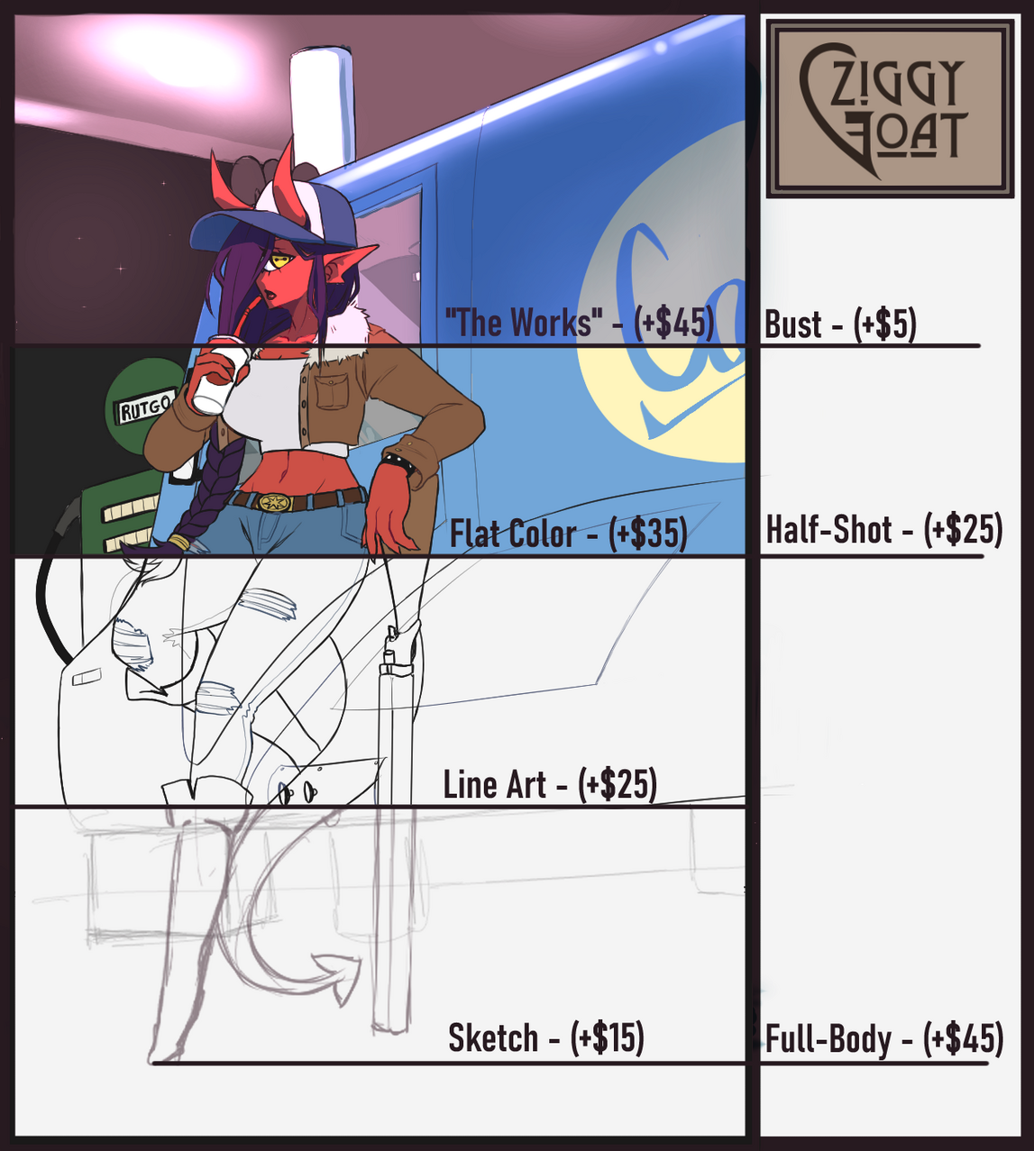 Welcome. I am Mr. Ziggy Goat, an artist of characters and creator of character designs! Let's see if we can bring your ideas to life, shall we? Once you are comfortable with the commission details, you may send me an email regarding your commission details! Please include exactly what style and cut of commission you want, the character(s) you want included, references, and your paypal email. I only use paypal for payment, so which ever email you would like me to send the invoice to is appreciated. I have explicit rights to deny a commission at any point as well as the right to display commissioned art on social media posts with full credentials given to the client in the post. If you have any questions, please feel free to send me an e-mail!